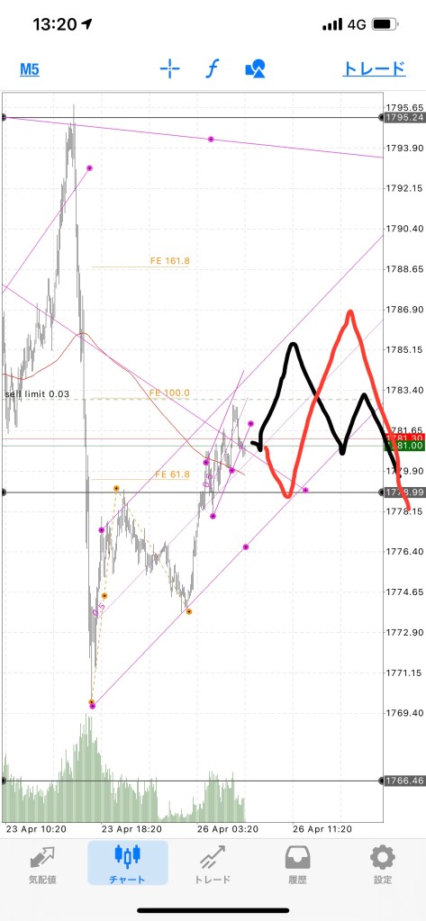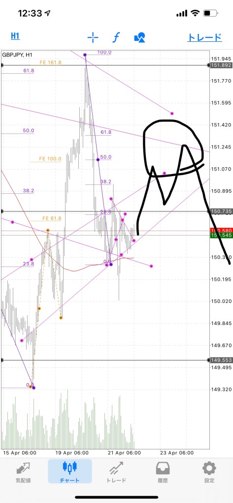 シナリオを立てた根拠として前の波で61.8と161.8でガツンと下に行ってきて、徐々に売りが優勢になってきているのと、〇のあたりで揉み合うだろうなと思う。